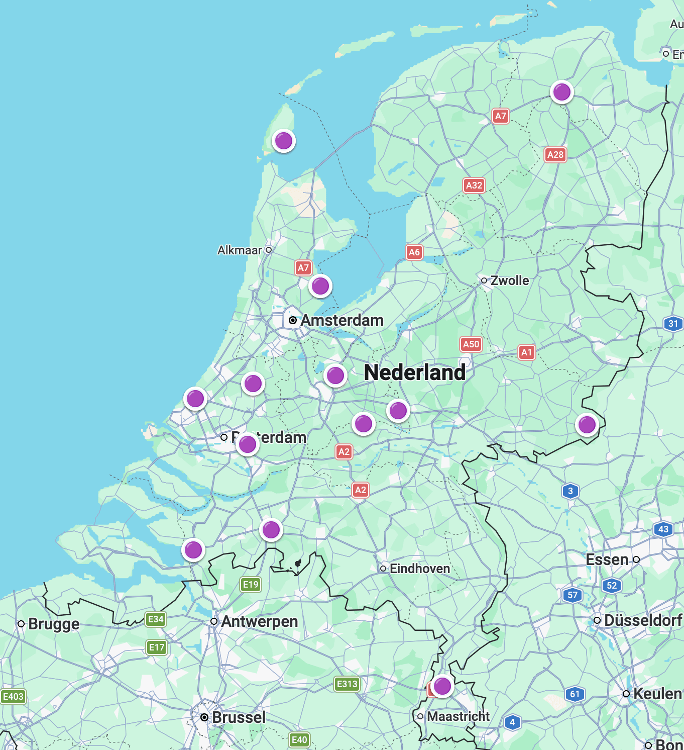 Het Nalatenschapsdossier is geen idee meer dat alleen op papier bestaat. Inmiddels werken er 13 collega’s mee, verspreid over Nederland. Op de kaart zie je waar we zitten — stuk voor stuk professionals die hebben besloten dat dit bij hen past.